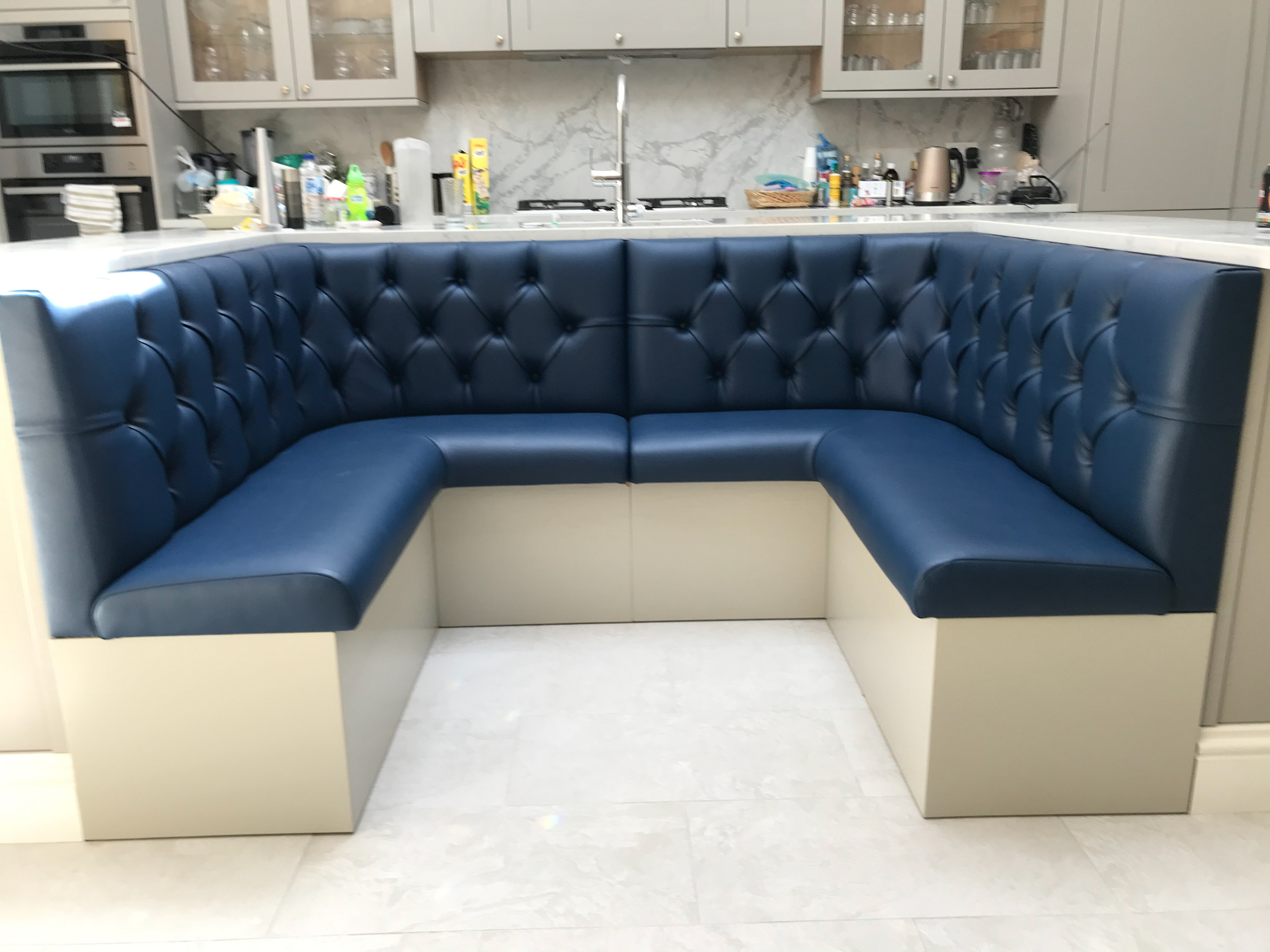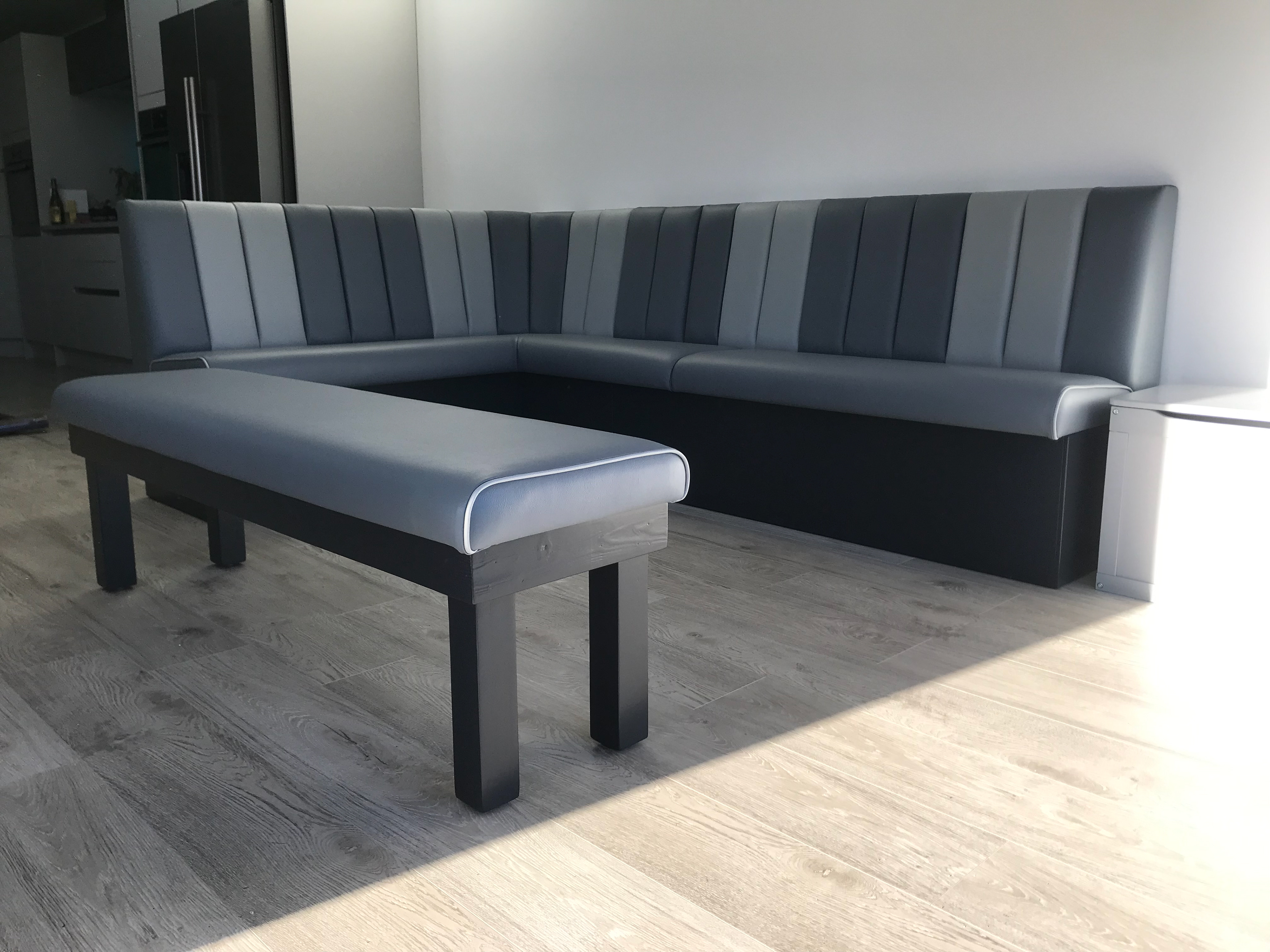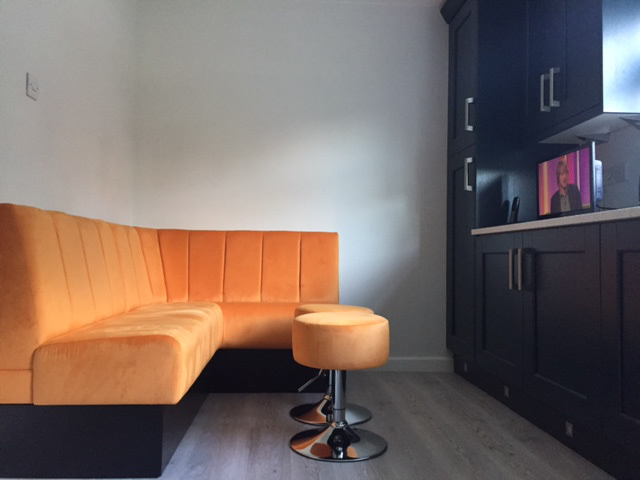 bespoke kitchen booth seating, dine in style and comfort with booth seating, banquette seating for a unique stylish look for your kitchen, made to measure to fit any awkward space and maximise dining space